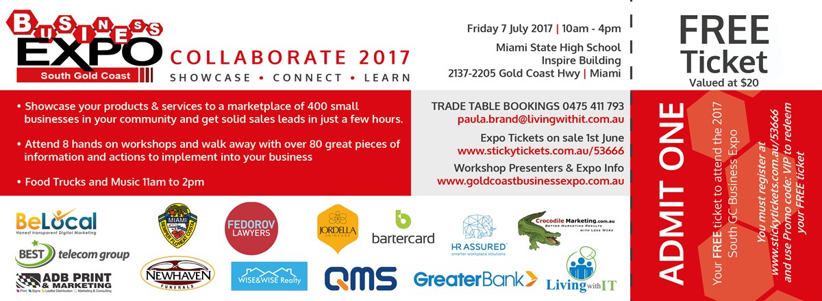 Friday, 7 July 2017 from 10:00 AM to 4:00 PM (E. Australia Standard Time) + Add to calendar07/07/2017 10:0007/07/2017 16:00Australia/Brisbane2017 South GC Business Expo ATTENDANCE TICKET2017 South GC Business Expo ATTENDANCE TICKET