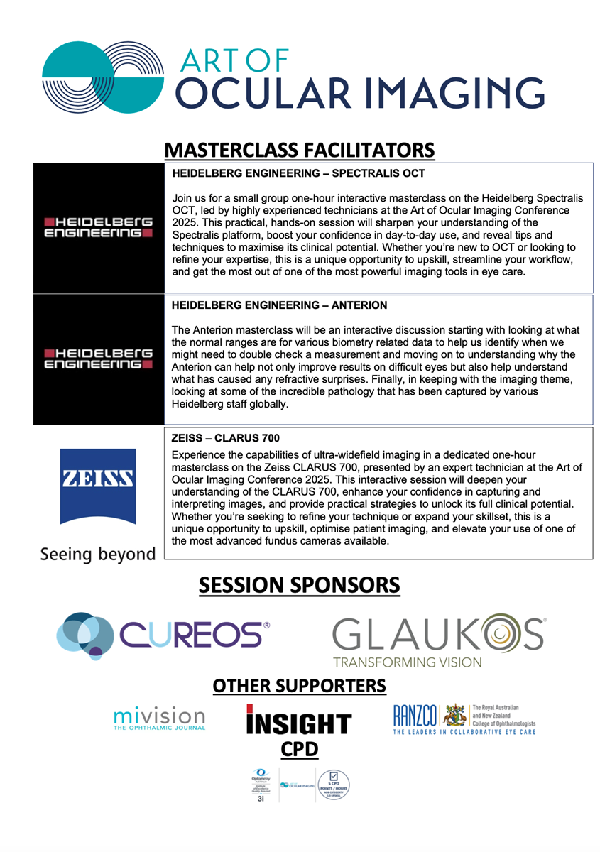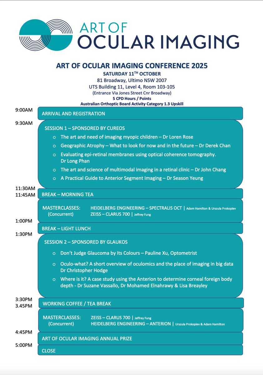Saturday, 11 October 2025 from 9:00 AM to 5:00 PM (AUS Eastern Daylight Time) + Add to calendar11/10/2025 09:0011/10/2025 17:00Australia/SydneyArt of Ocular Imaging Conference 2025Art of Ocular Imaging Conference 2025