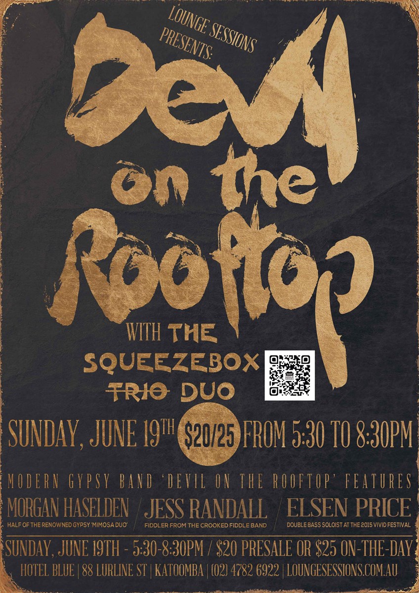 Sunday, 19 June 2016 from 5:30 PM to 8:30 PM (AUS Eastern Standard Time) + Add to calendar19/06/2016 17:3019/06/2016 20:30Australia/SydneyDevil on the Rooftop & The Squeezebox Duo 'Live in the Attic'Devil on the Rooftop & The Squeezebox Duo 'Live in the Attic'