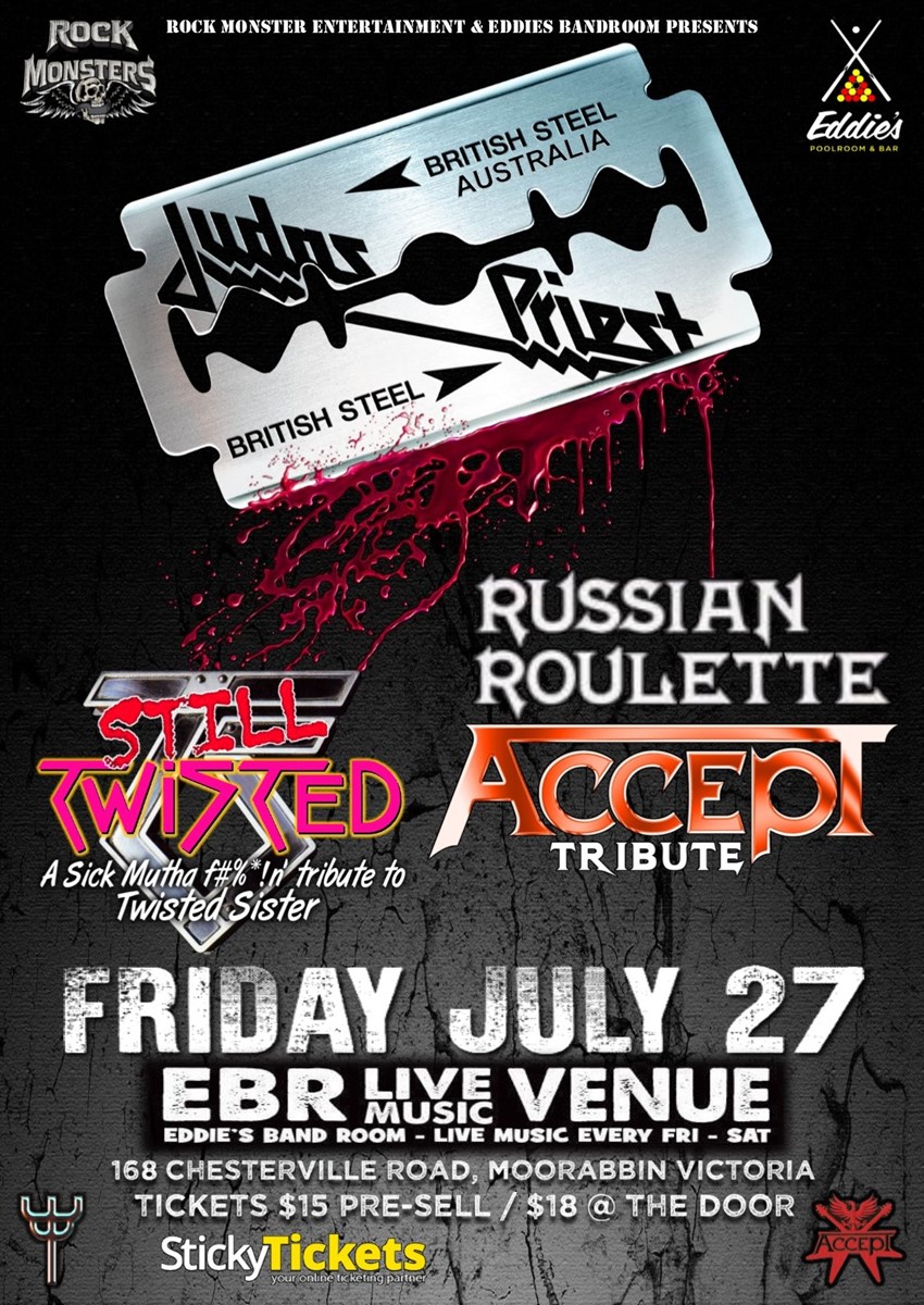 Friday, 27 July 2018 from 8:00 PM - Saturday, 28 July 2018 to 1:00 AM (AUS Eastern Standard Time) + Add to calendar27/07/2018 20:0028/07/2018 01:00Australia/SydneyRock Monsters British Steel, Russian Roulette, Still TwistedRock Monsters British Steel, Russian Roulette, Still Twisted