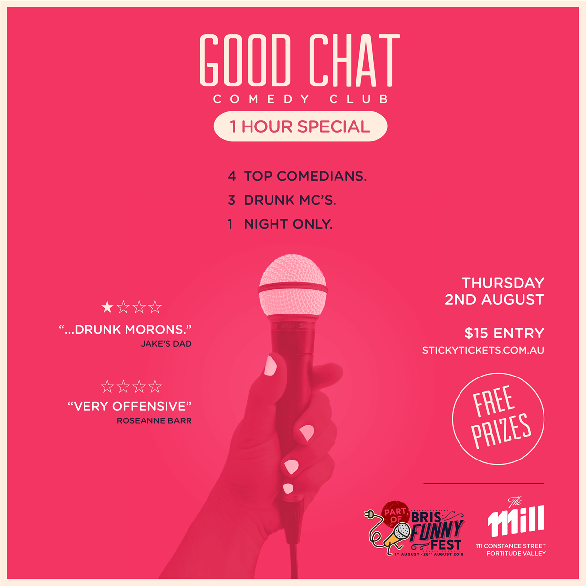 Thursday, 2 August 2018 from 7:00 PM to 8:30 PM (E. Australia Standard Time) + Add to calendar02/08/2018 19:0002/08/2018 20:30Australia/BrisbaneGood Chat Comedy Club: 1 Hour SpecialGood Chat Comedy Club: 1 Hour Special