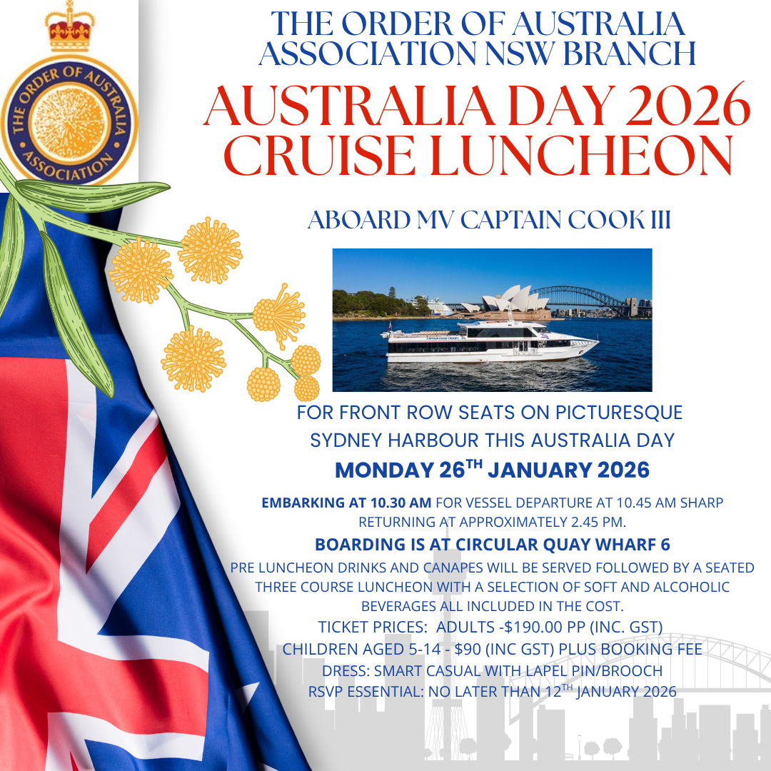 Monday, 26 January 2026 leaving at 10:30 AM until approx 2:45 PM (AUS Eastern Daylight Time) + Add to calendar26/01/2026 10:3026/01/2026 14:45Australia/SydneyThe Order of Australia Association NSW Branch 2026 Australia Day Cruise LuncheonThe Order of Australia Association NSW Branch 2026 Australia Day Cruise Luncheon