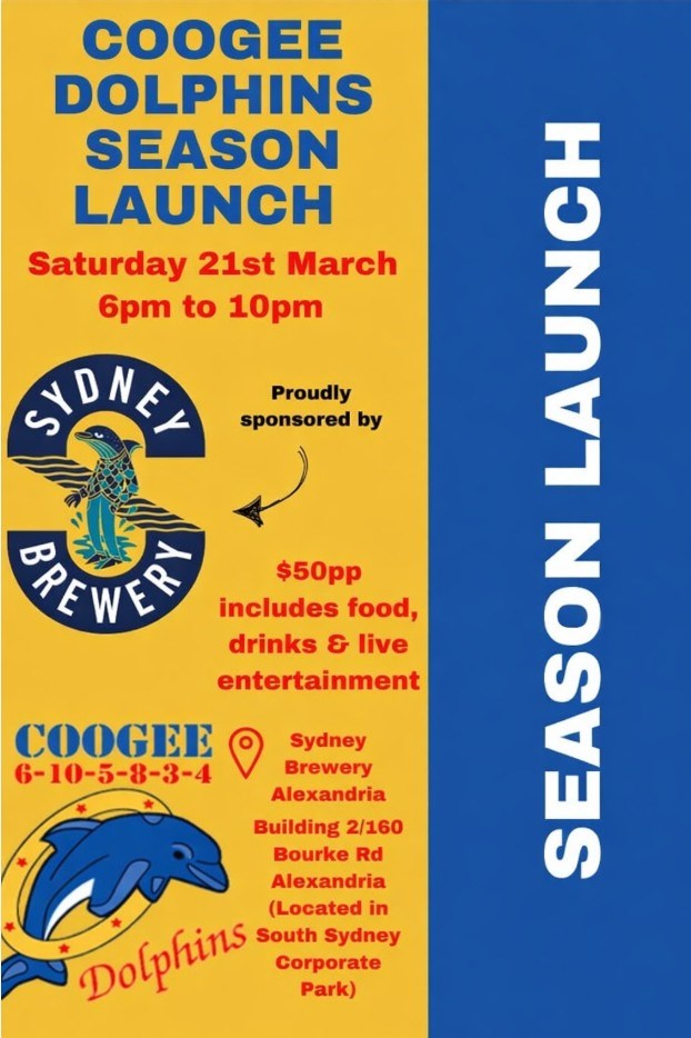 Saturday, 21 March 2026 from 6:00 PM to 10:00 PM (AUS Eastern Daylight Time) + Add to calendar21/03/2026 18:0021/03/2026 22:00Australia/Sydney2026 Coogee Dolphins Season's Launch2026 Coogee Dolphins Season's Launch