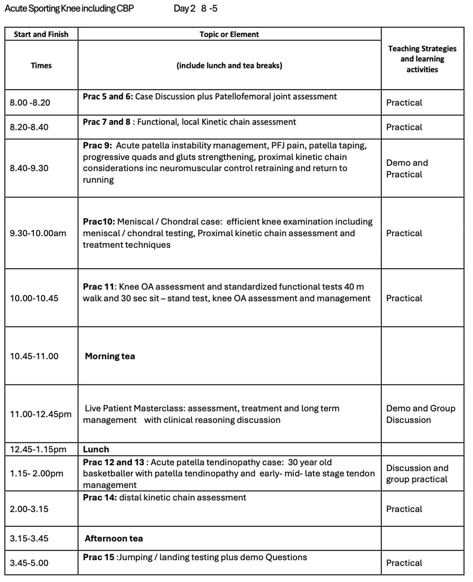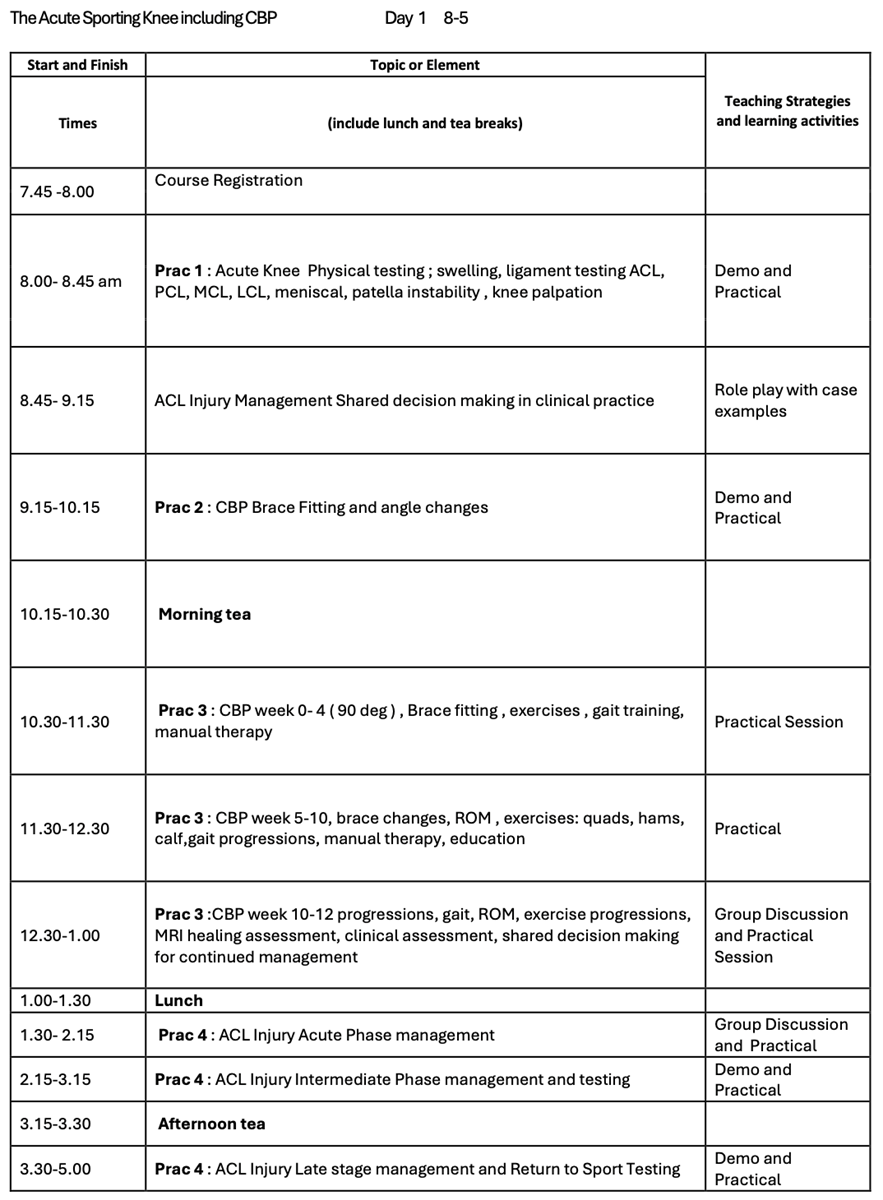 The practical workshop will cover acute knee assessment, practical shared decision making in ACL injury management, brace fitting, rehabilitation through the bracing protocol stages in addition to contemporary evidence based ACL rehabilitation from brace removal through to return to sport.