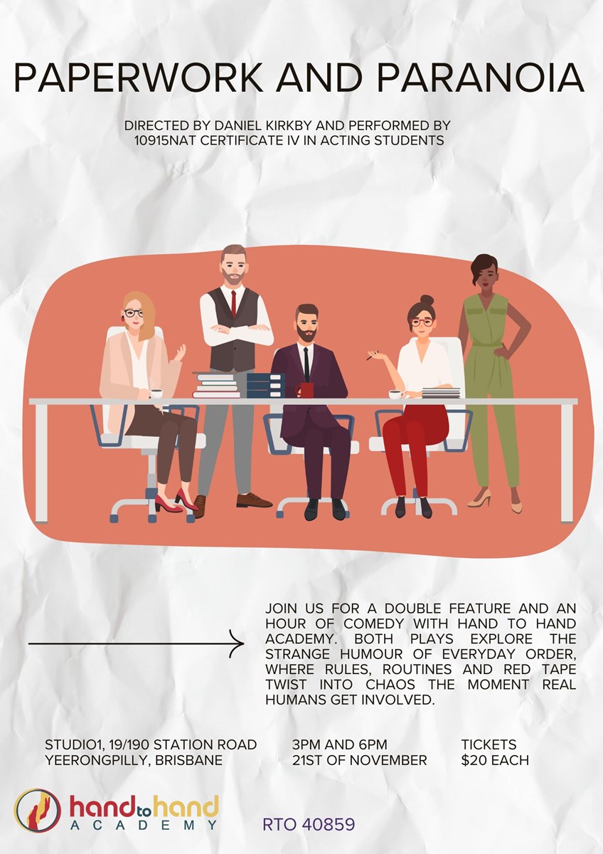 Join the students of Hand to Hand Academy (RTO 40859) for an hour of sharp comedy, quick wit and total administrative meltdown. It’s paperwork, pandemonium and pure performance.
