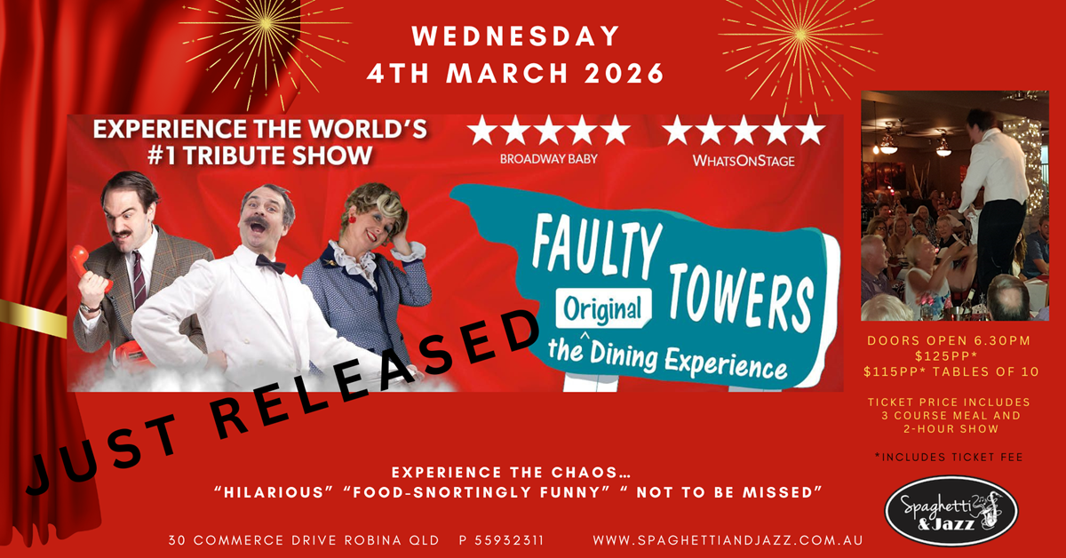 Wednesday, 4 March 2026 from 6:30 PM to 9:00 PM (E. Australia Standard Time) + Add to calendar04/03/2026 18:3004/03/2026 21:00Australia/BrisbaneFAULTY TOWERS DINING EXPERIENCEFAULTY TOWERS DINING EXPERIENCE