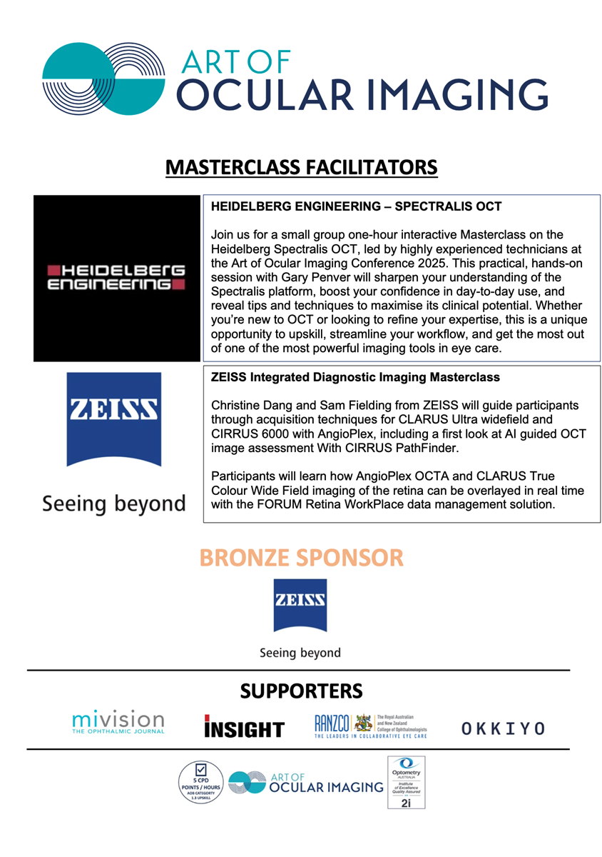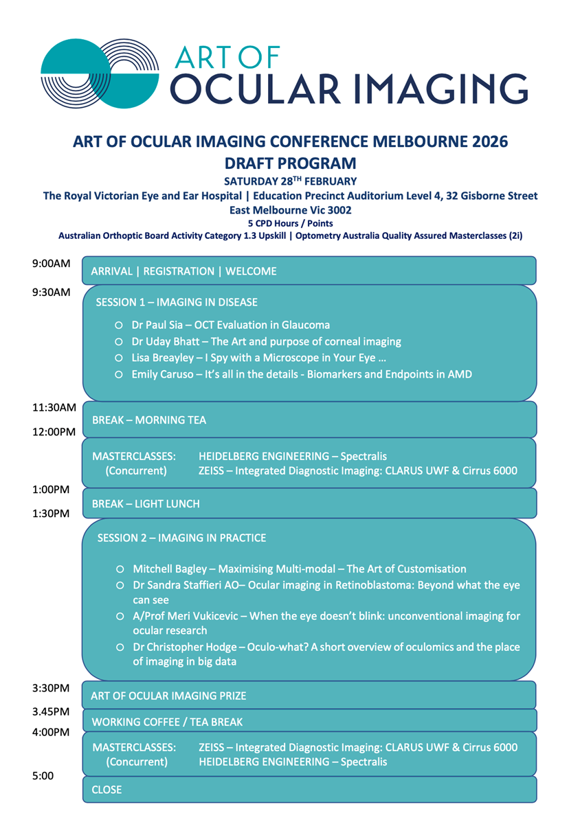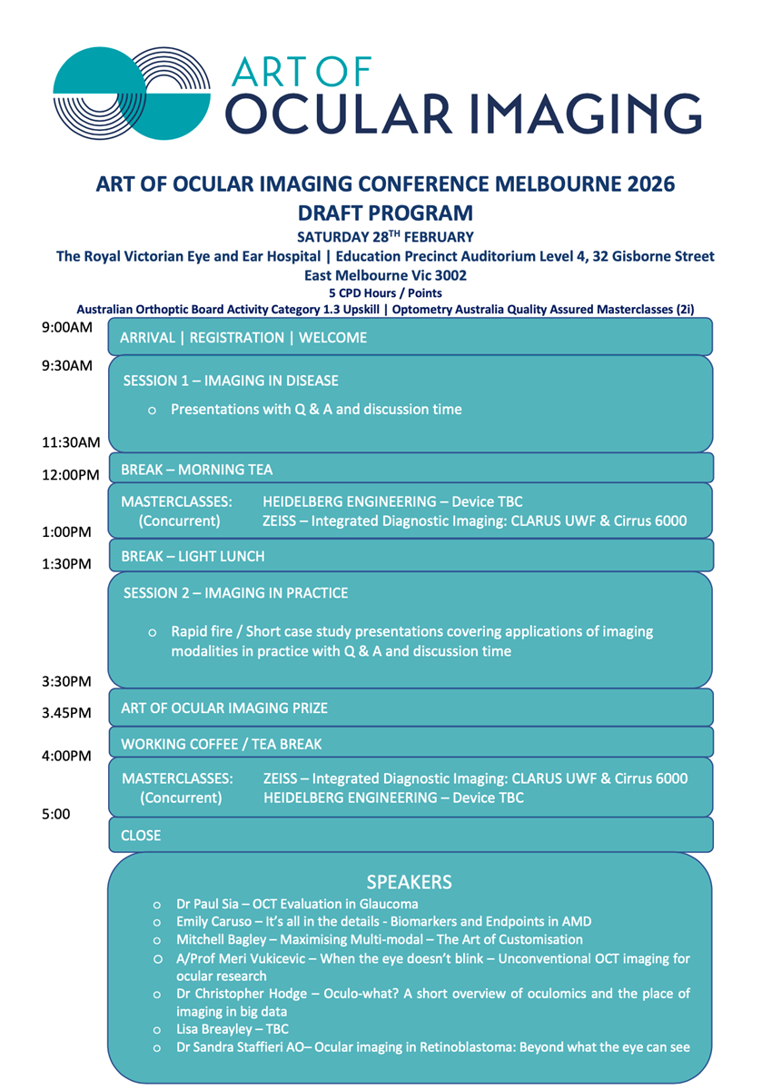 We look forward to seeing you at the inaugural Art of Ocular Imaging Conference in Melbourne.