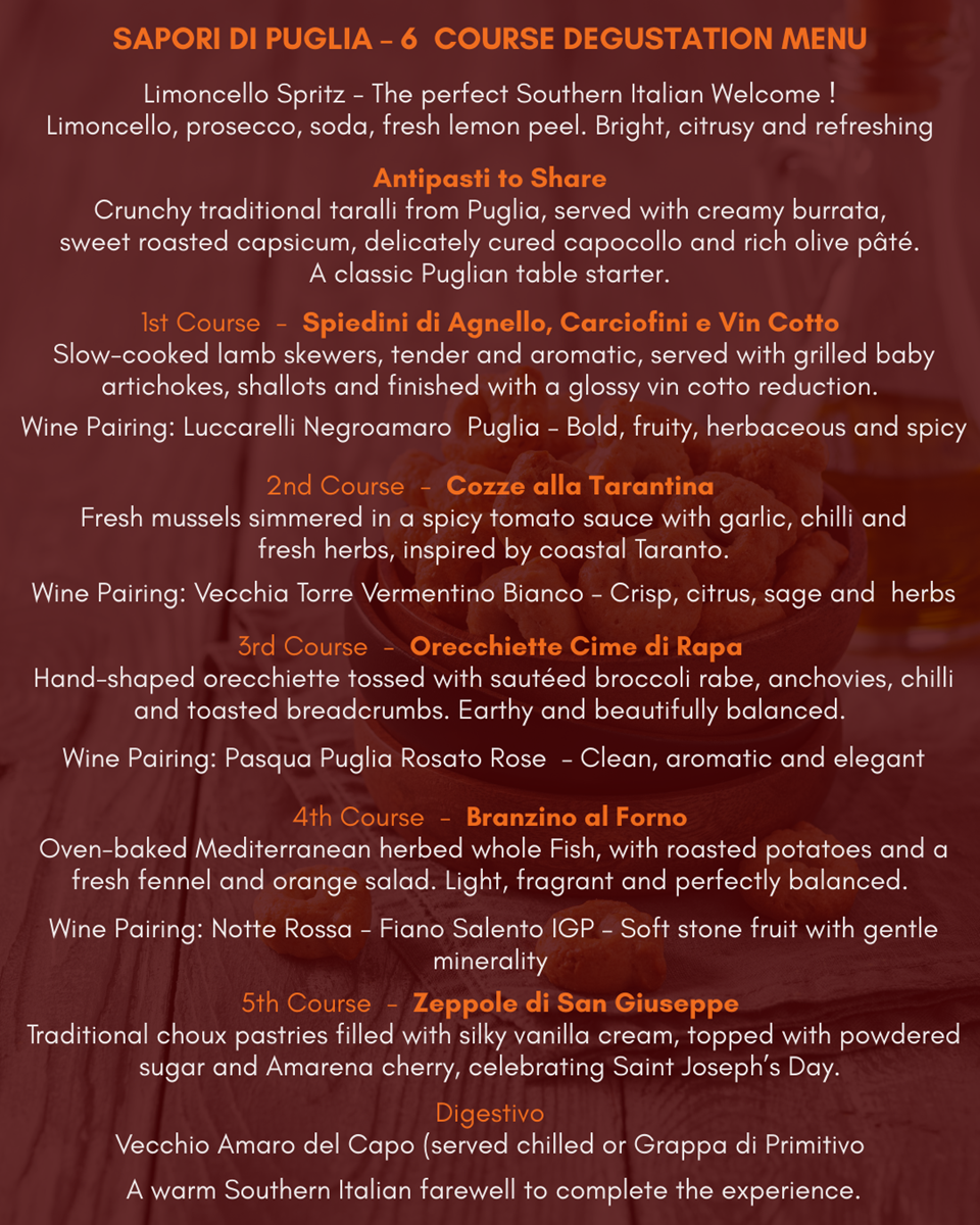 Each course is thoughtfully paired with expressive wines from Puglia — including Vermentino, Fiano, Rosato and Negroamaro — alongside a welcoming Spritz and a traditional Italian digestivo to close the evening.