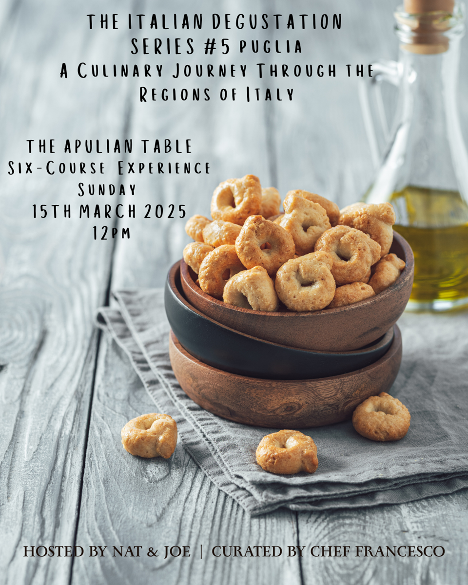 Set against soft ambient southern Italian music — echoing seaside villages, olive groves and warm Mediterranean evenings — The Puglian Table is intimate, generous and beautifully balanced.