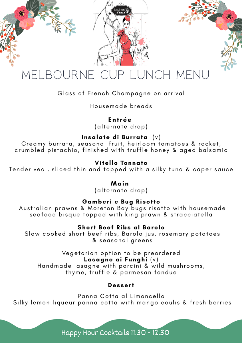 Ladies & Gents, don those fancy fascinators and hats and dress up for the event as there are prizes to be won!Enjoy a glass of French bubbles on arrival and a delicious 3 course menu crafted by our Head Chef Francesco.